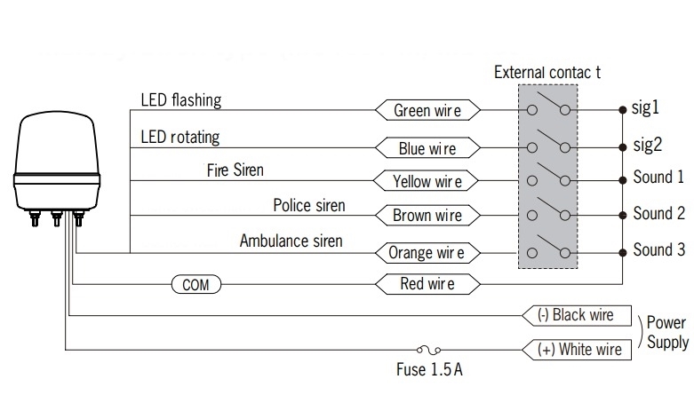 How is the Menics MS135T-S00-R beacon light wired? Menics MS135T-S00-R 135mm Beacon Light, 12-24V, Red, w/ Siren